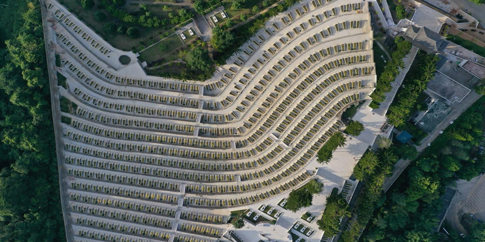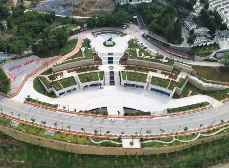 步入烈士陵园,首先映入眼帘的是烈士陵园纪念广场。广场总体规划上采用“亮剑”造型,从下往上看分别为“剑首”、“剑把”、“护手”、“剑身”。圆形纪念广场为“剑首”,市民广场与纪念广场的踏步台阶为“剑把”,两侧市民广场为“护手”,音乐喷泉中间走道为剑身,整体堪似一把“将要出鞘的宝剑”。寓意:“中国人民解放军是威武之师、文明之师、和平之师,有能力、有决心捍卫国家主权和维护领土完整”。